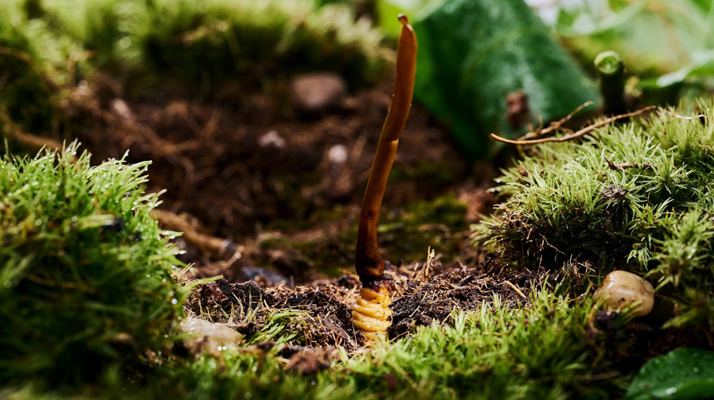 第二年開春,雪水順著草甸的縫隙往下滲,凍土慢慢融化,草原開始冒出新綠的時候,真菌就會從蟲子的身體里“醒”過來。它會順著蟲子的頭部,慢慢往上長,穿過土層,最后冒出地面,長成一根細細的、棕褐色的“草”——我們叫它“草頭”,草頭頂端還會結出小小的孢子囊,等風吹過,孢子又會落到土里,開始新的循環(huán)。而那只曾經(jīng)的蝙蝠蛾幼蟲,身體已經(jīng)變得僵硬,外殼緊緊包裹著真菌的菌絲,就像給“草”做了個“蟲形的根”,這就是我們挖的冬蟲夏草——下面是蟲的身子,上面是真菌長出來的“草”。?